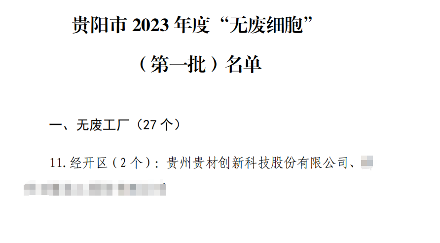 近日,貴陽(yáng)市 2023 年度“無廢細(xì)胞”(第一批)名單已經(jīng)市“無廢城市”建設(shè)工作領(lǐng)導(dǎo)小組審定,貴州貴材創(chuàng)新科技股份有限公司(以下簡(jiǎn)稱“貴材科技”)榮獲貴陽(yáng)市2023年度“無廢工廠”稱號(hào)。